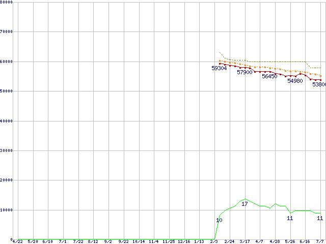 ※このグラフは過去のデータも税率5%相当に調整した税込み相当額のグラフです。 税率変更や、総額表示方式導入(2004年4月)の影響は除いています。 | | | ●凡例 | 最安値 (点線部は販売店未確認 または未調査) | 平均値 | 最高値 | ショップ数 |