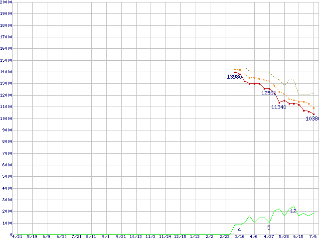※このグラフは過去のデータも税率5%相当に調整した税込み相当額のグラフです。 税率変更や、総額表示方式導入(2004年4月)の影響は除いています。 | | | ●凡例 | 最安値 (点線部は販売店未確認 または未調査) | 平均値 | 最高値 | ショップ数 |