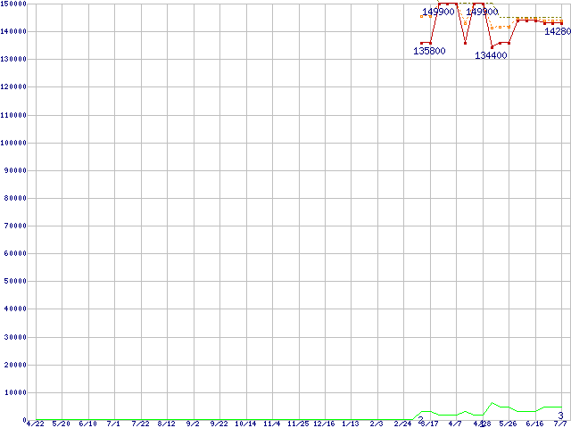 ※このグラフは過去のデータも税率5%相当に調整した税込み相当額のグラフです。 税率変更や、総額表示方式導入(2004年4月)の影響は除いています。 | | | ●凡例 | 最安値 (点線部は販売店未確認 または未調査) | 平均値 | 最高値 | ショップ数 |