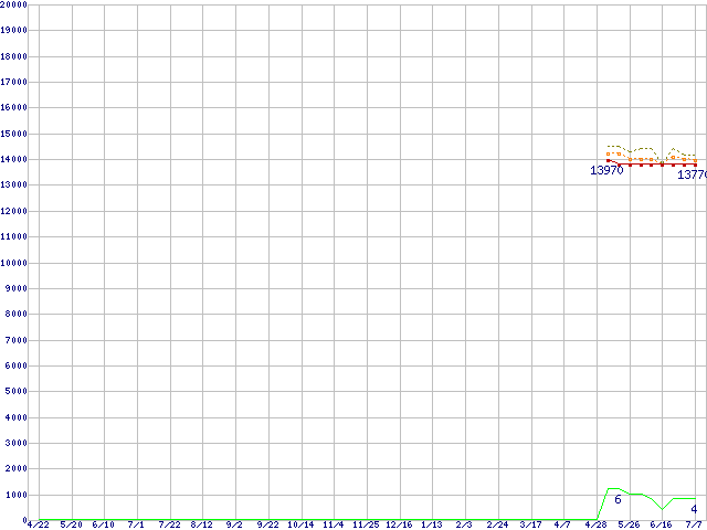 ※このグラフは過去のデータも税率5%相当に調整した税込み相当額のグラフです。 税率変更や、総額表示方式導入(2004年4月)の影響は除いています。 | | | ●凡例 | 最安値 (点線部は販売店未確認 または未調査) | 平均値 | 最高値 | ショップ数 |
