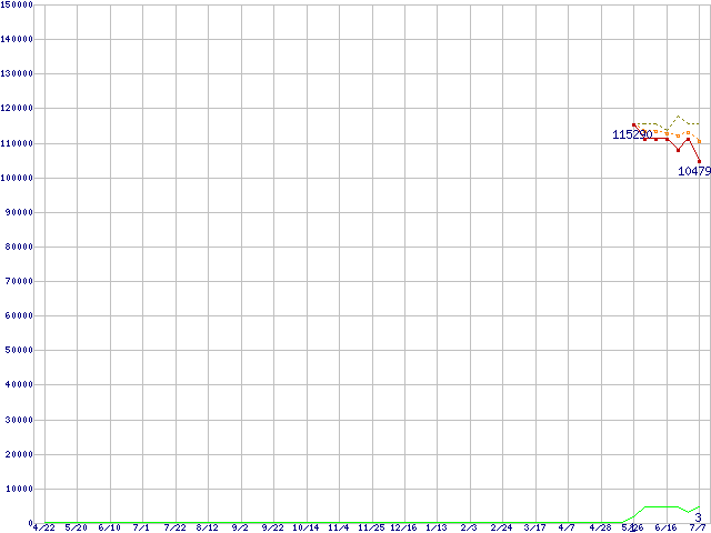 ※このグラフは過去のデータも税率5%相当に調整した税込み相当額のグラフです。 税率変更や、総額表示方式導入(2004年4月)の影響は除いています。 | | | ●凡例 | 最安値 (点線部は販売店未確認 または未調査) | 平均値 | 最高値 | ショップ数 |