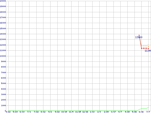 ※このグラフは過去のデータも税率5%相当に調整した税込み相当額のグラフです。 税率変更や、総額表示方式導入(2004年4月)の影響は除いています。 | | | ●凡例 | 最安値 (点線部は販売店未確認 または未調査) | 平均値 | 最高値 | ショップ数 |