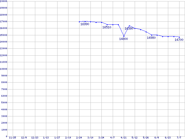 | LGA 775 (FSB 533MHz,L2 1MB×2,Dual Core,EM64T対応)の最安値推移 | | | (2005年11月25日~2006年7月7日) |