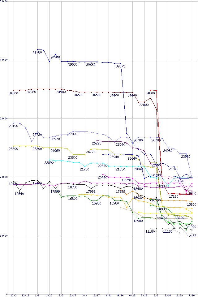 | CPU主要製品(最安値1万円~2万円未満)の最安値推移 | | | (2005年12月2日~2006年7月14日) |
