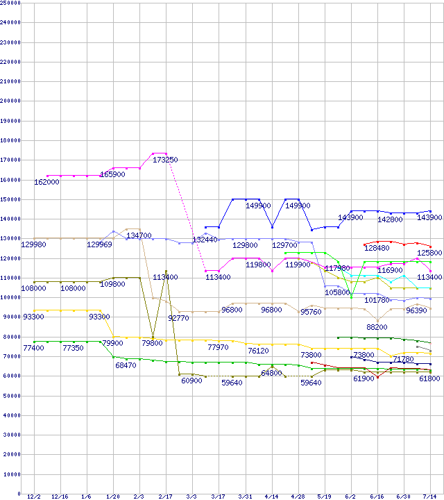 | CPU主要製品(最安値6万円以上)の最安値推移 | | | (2005年12月2日~2006年7月14日) |
