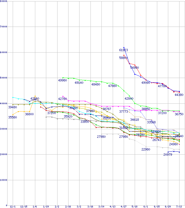 | HDD主要製品(最安値2万円以上)の最安値推移 | | | (2005年12月1日~2006年7月13日) |