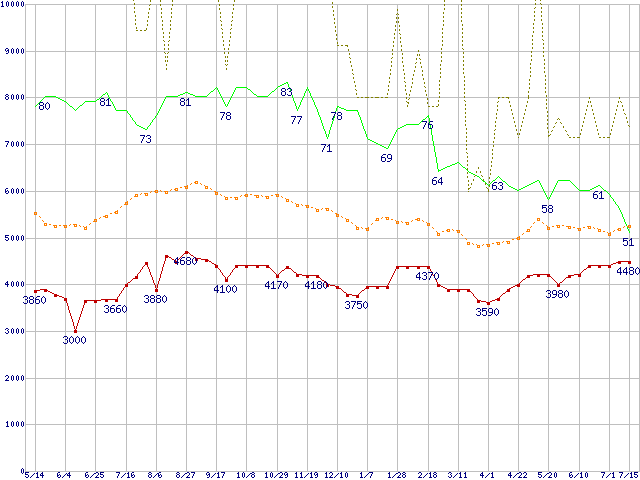 ※このグラフは過去のデータも税率5%相当に調整した税込み相当額のグラフです。 税率変更や、総額表示方式導入(2004年4月)の影響は除いています。 | | | ●凡例 | 最安値 (点線部は販売店未確認 または未調査) | 平均値 | 最高値 | ショップ数 |