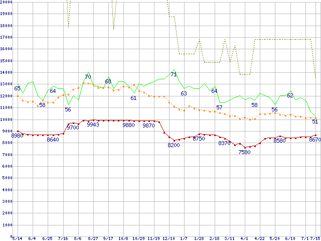 ※このグラフは過去のデータも税率5%相当に調整した税込み相当額のグラフです。 税率変更や、総額表示方式導入(2004年4月)の影響は除いています。 | | | ●凡例 | 最安値 (点線部は販売店未確認 または未調査) | 平均値 | 最高値 | ショップ数 |