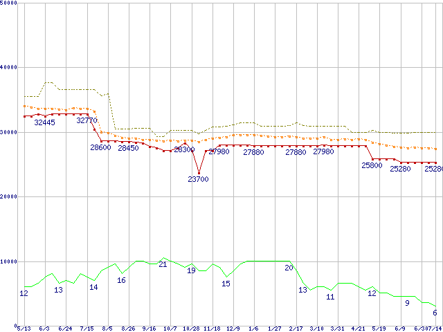 ※このグラフは過去のデータも税率5%相当に調整した税込み相当額のグラフです。 税率変更や、総額表示方式導入(2004年4月)の影響は除いています。 | | | ●凡例 | 最安値 (点線部は販売店未確認 または未調査) | 平均値 | 最高値 | ショップ数 |