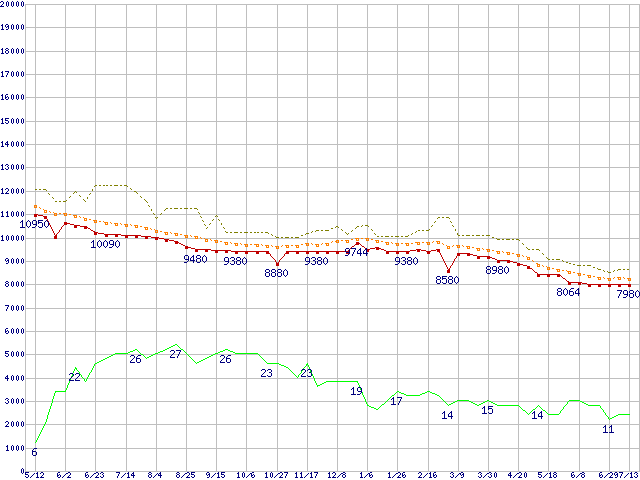 ※このグラフは過去のデータも税率5%相当に調整した税込み相当額のグラフです。 税率変更や、総額表示方式導入(2004年4月)の影響は除いています。 | | | ●凡例 | 最安値 (点線部は販売店未確認 または未調査) | 平均値 | 最高値 | ショップ数 |