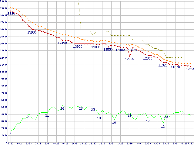 ※このグラフは過去のデータも税率5%相当に調整した税込み相当額のグラフです。 税率変更や、総額表示方式導入(2004年4月)の影響は除いています。 | | | ●凡例 | 最安値 (点線部は販売店未確認 または未調査) | 平均値 | 最高値 | ショップ数 |