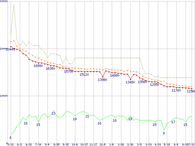 ※このグラフは過去のデータも税率5%相当に調整した税込み相当額のグラフです。 税率変更や、総額表示方式導入(2004年4月)の影響は除いています。 | | | ●凡例 | 最安値 (点線部は販売店未確認 または未調査) | 平均値 | 最高値 | ショップ数 |