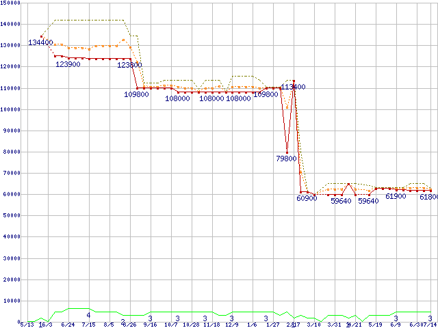 ※このグラフは過去のデータも税率5%相当に調整した税込み相当額のグラフです。 税率変更や、総額表示方式導入(2004年4月)の影響は除いています。 | | | ●凡例 | 最安値 (点線部は販売店未確認 または未調査) | 平均値 | 最高値 | ショップ数 |