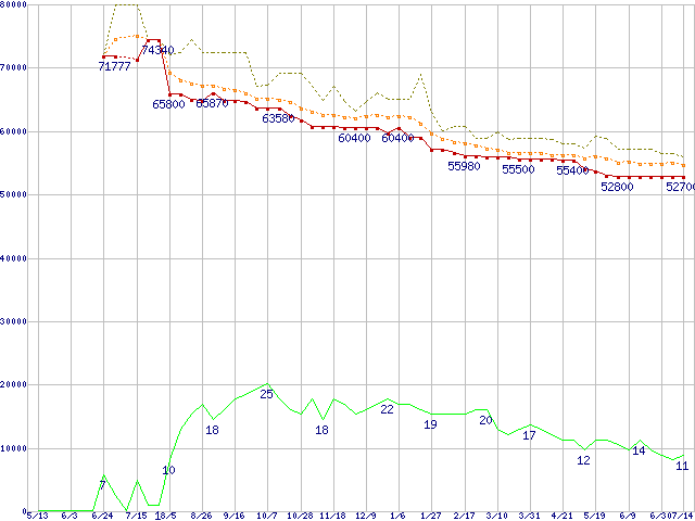 ※このグラフは過去のデータも税率5%相当に調整した税込み相当額のグラフです。 税率変更や、総額表示方式導入(2004年4月)の影響は除いています。 | | | ●凡例 | 最安値 (点線部は販売店未確認 または未調査) | 平均値 | 最高値 | ショップ数 |
