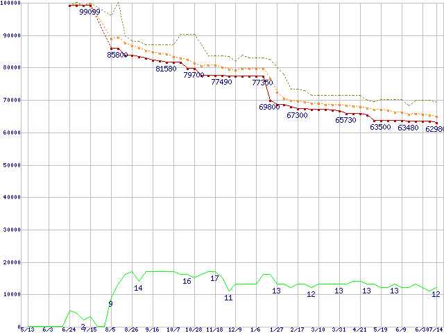 ※このグラフは過去のデータも税率5%相当に調整した税込み相当額のグラフです。 税率変更や、総額表示方式導入(2004年4月)の影響は除いています。 | | | ●凡例 | 最安値 (点線部は販売店未確認 または未調査) | 平均値 | 最高値 | ショップ数 |