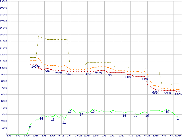 ※このグラフは過去のデータも税率5%相当に調整した税込み相当額のグラフです。 税率変更や、総額表示方式導入(2004年4月)の影響は除いています。 | | | ●凡例 | 最安値 (点線部は販売店未確認 または未調査) | 平均値 | 最高値 | ショップ数 |