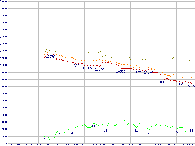 ※このグラフは過去のデータも税率5%相当に調整した税込み相当額のグラフです。 税率変更や、総額表示方式導入(2004年4月)の影響は除いています。 | | | ●凡例 | 最安値 (点線部は販売店未確認 または未調査) | 平均値 | 最高値 | ショップ数 |