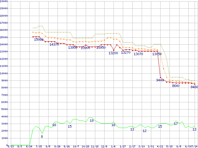 ※このグラフは過去のデータも税率5%相当に調整した税込み相当額のグラフです。 税率変更や、総額表示方式導入(2004年4月)の影響は除いています。 | | | ●凡例 | 最安値 (点線部は販売店未確認 または未調査) | 平均値 | 最高値 | ショップ数 |