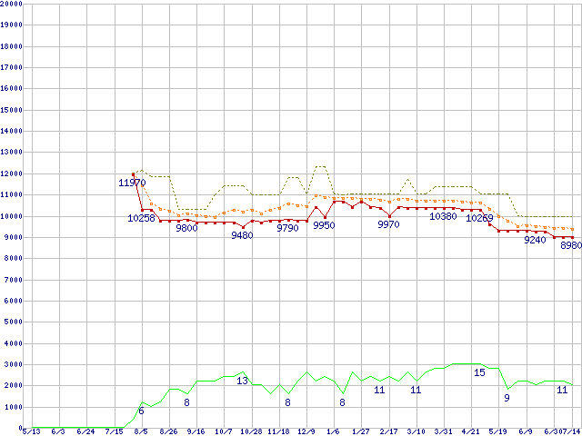 ※このグラフは過去のデータも税率5%相当に調整した税込み相当額のグラフです。 税率変更や、総額表示方式導入(2004年4月)の影響は除いています。 | | | ●凡例 | 最安値 (点線部は販売店未確認 または未調査) | 平均値 | 最高値 | ショップ数 |