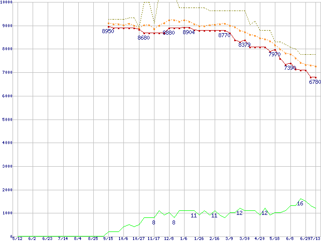 ※このグラフは過去のデータも税率5%相当に調整した税込み相当額のグラフです。 税率変更や、総額表示方式導入(2004年4月)の影響は除いています。 | | | ●凡例 | 最安値 (点線部は販売店未確認 または未調査) | 平均値 | 最高値 | ショップ数 |