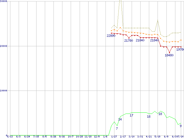 ※このグラフは過去のデータも税率5%相当に調整した税込み相当額のグラフです。 税率変更や、総額表示方式導入(2004年4月)の影響は除いています。 | | | ●凡例 | 最安値 (点線部は販売店未確認 または未調査) | 平均値 | 最高値 | ショップ数 |