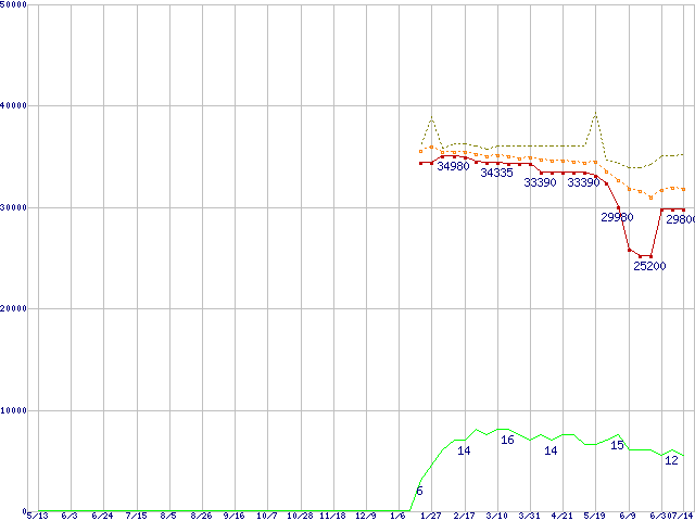 ※このグラフは過去のデータも税率5%相当に調整した税込み相当額のグラフです。 税率変更や、総額表示方式導入(2004年4月)の影響は除いています。 | | | ●凡例 | 最安値 (点線部は販売店未確認 または未調査) | 平均値 | 最高値 | ショップ数 |
