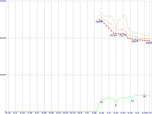 ※このグラフは過去のデータも税率5%相当に調整した税込み相当額のグラフです。 税率変更や、総額表示方式導入(2004年4月)の影響は除いています。 | | | ●凡例 | 最安値 (点線部は販売店未確認 または未調査) | 平均値 | 最高値 | ショップ数 |