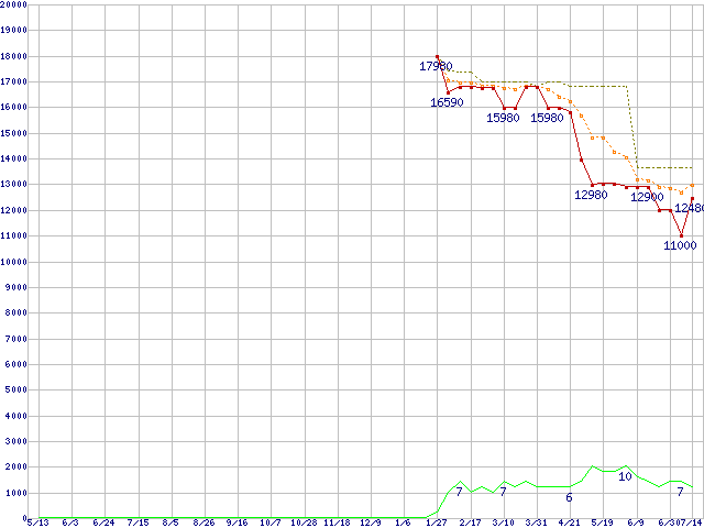 ※このグラフは過去のデータも税率5%相当に調整した税込み相当額のグラフです。 税率変更や、総額表示方式導入(2004年4月)の影響は除いています。 | | | ●凡例 | 最安値 (点線部は販売店未確認 または未調査) | 平均値 | 最高値 | ショップ数 |