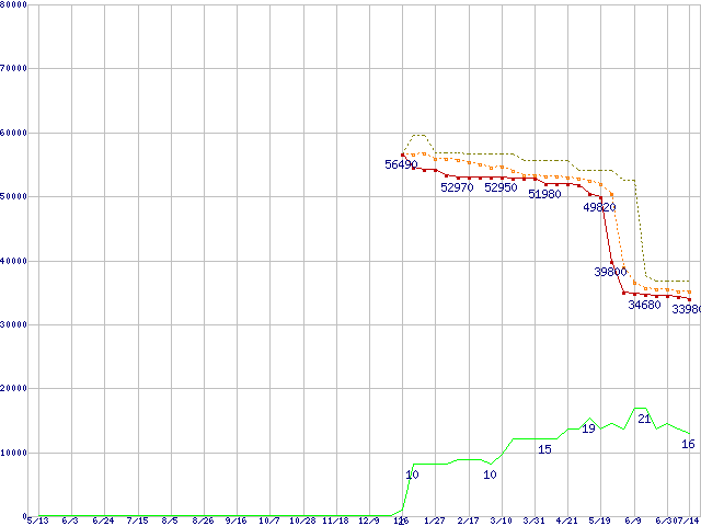 ※このグラフは過去のデータも税率5%相当に調整した税込み相当額のグラフです。 税率変更や、総額表示方式導入(2004年4月)の影響は除いています。 | | | ●凡例 | 最安値 (点線部は販売店未確認 または未調査) | 平均値 | 最高値 | ショップ数 |