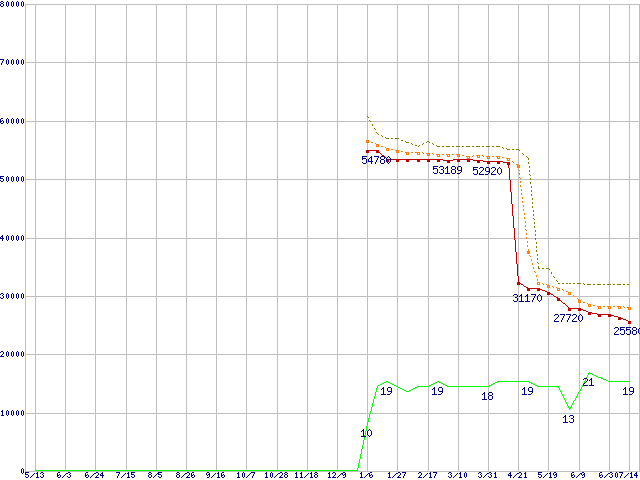 ※このグラフは過去のデータも税率5%相当に調整した税込み相当額のグラフです。 税率変更や、総額表示方式導入(2004年4月)の影響は除いています。 | | | ●凡例 | 最安値 (点線部は販売店未確認 または未調査) | 平均値 | 最高値 | ショップ数 |