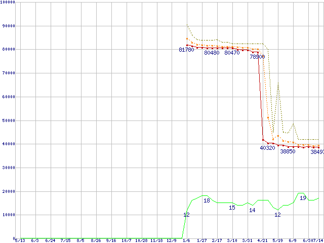 ※このグラフは過去のデータも税率5%相当に調整した税込み相当額のグラフです。 税率変更や、総額表示方式導入(2004年4月)の影響は除いています。 | | | ●凡例 | 最安値 (点線部は販売店未確認 または未調査) | 平均値 | 最高値 | ショップ数 |