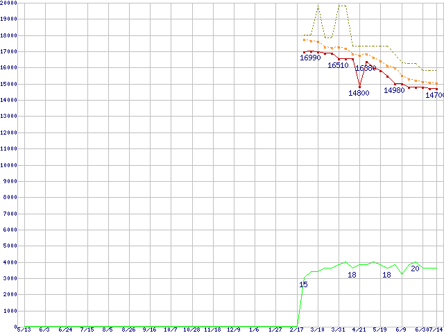 ※このグラフは過去のデータも税率5%相当に調整した税込み相当額のグラフです。 税率変更や、総額表示方式導入(2004年4月)の影響は除いています。 | | | ●凡例 | 最安値 (点線部は販売店未確認 または未調査) | 平均値 | 最高値 | ショップ数 |