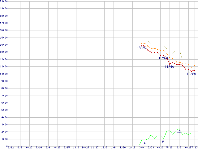 ※このグラフは過去のデータも税率5%相当に調整した税込み相当額のグラフです。 税率変更や、総額表示方式導入(2004年4月)の影響は除いています。 | | | ●凡例 | 最安値 (点線部は販売店未確認 または未調査) | 平均値 | 最高値 | ショップ数 |