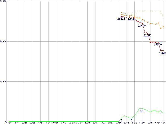 ※このグラフは過去のデータも税率5%相当に調整した税込み相当額のグラフです。 税率変更や、総額表示方式導入(2004年4月)の影響は除いています。 | | | ●凡例 | 最安値 (点線部は販売店未確認 または未調査) | 平均値 | 最高値 | ショップ数 |