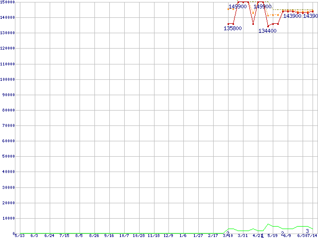 ※このグラフは過去のデータも税率5%相当に調整した税込み相当額のグラフです。 税率変更や、総額表示方式導入(2004年4月)の影響は除いています。 | | | ●凡例 | 最安値 (点線部は販売店未確認 または未調査) | 平均値 | 最高値 | ショップ数 |