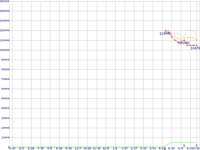 ※このグラフは過去のデータも税率5%相当に調整した税込み相当額のグラフです。 税率変更や、総額表示方式導入(2004年4月)の影響は除いています。 | | | ●凡例 | 最安値 (点線部は販売店未確認 または未調査) | 平均値 | 最高値 | ショップ数 |