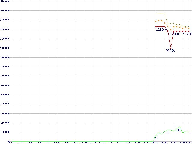 ※このグラフは過去のデータも税率5%相当に調整した税込み相当額のグラフです。 税率変更や、総額表示方式導入(2004年4月)の影響は除いています。 | | | ●凡例 | 最安値 (点線部は販売店未確認 または未調査) | 平均値 | 最高値 | ショップ数 |