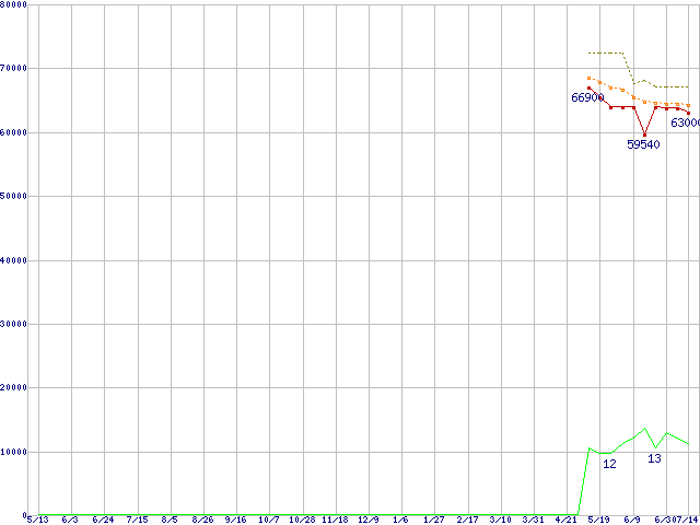 ※このグラフは過去のデータも税率5%相当に調整した税込み相当額のグラフです。 税率変更や、総額表示方式導入(2004年4月)の影響は除いています。 | | | ●凡例 | 最安値 (点線部は販売店未確認 または未調査) | 平均値 | 最高値 | ショップ数 |