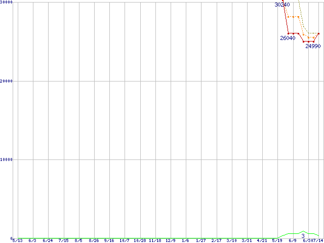 ※このグラフは過去のデータも税率5%相当に調整した税込み相当額のグラフです。 税率変更や、総額表示方式導入(2004年4月)の影響は除いています。 | | | ●凡例 | 最安値 (点線部は販売店未確認 または未調査) | 平均値 | 最高値 | ショップ数 |