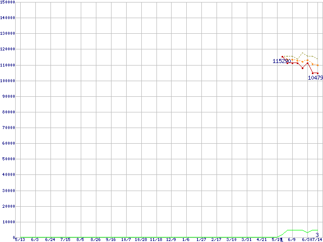 ※このグラフは過去のデータも税率5%相当に調整した税込み相当額のグラフです。 税率変更や、総額表示方式導入(2004年4月)の影響は除いています。 | | | ●凡例 | 最安値 (点線部は販売店未確認 または未調査) | 平均値 | 最高値 | ショップ数 |