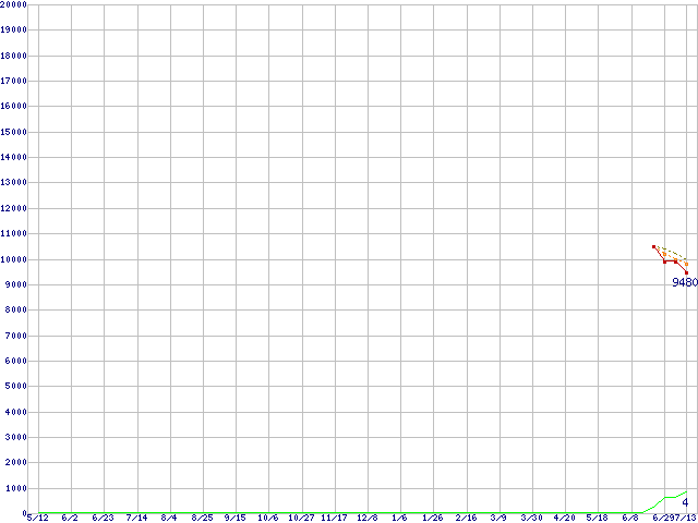 ※このグラフは過去のデータも税率5%相当に調整した税込み相当額のグラフです。 税率変更や、総額表示方式導入(2004年4月)の影響は除いています。 | | | ●凡例 | 最安値 (点線部は販売店未確認 または未調査) | 平均値 | 最高値 | ショップ数 |
