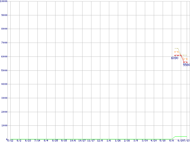 ※このグラフは過去のデータも税率5%相当に調整した税込み相当額のグラフです。 税率変更や、総額表示方式導入(2004年4月)の影響は除いています。 | | | ●凡例 | 最安値 (点線部は販売店未確認 または未調査) | 平均値 | 最高値 | ショップ数 |