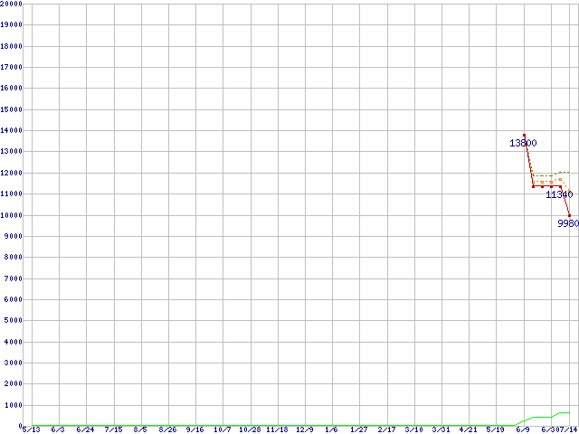 ※このグラフは過去のデータも税率5%相当に調整した税込み相当額のグラフです。 税率変更や、総額表示方式導入(2004年4月)の影響は除いています。 | | | ●凡例 | 最安値 (点線部は販売店未確認 または未調査) | 平均値 | 最高値 | ショップ数 |