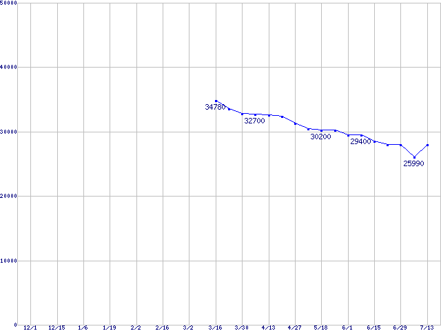 | MaXLine Pro 500 (7200rpm,16MB,Serial ATA II,3Gbps)の最安値推移 | | | (2005年12月1日~2006年7月13日) |
