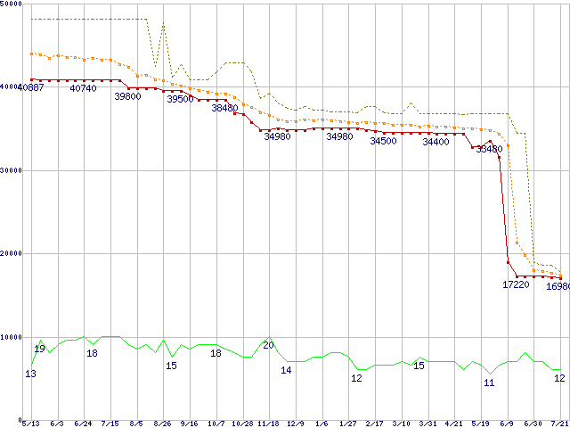 ※このグラフは過去のデータも税率5%相当に調整した税込み相当額のグラフです。 税率変更や、総額表示方式導入(2004年4月)の影響は除いています。 | | | ●凡例 | 最安値 (点線部は販売店未確認 または未調査) | 平均値 | 最高値 | ショップ数 |