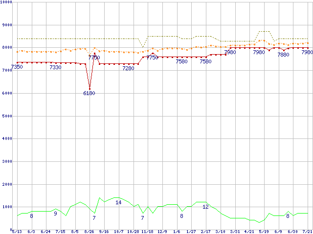 ※このグラフは過去のデータも税率5%相当に調整した税込み相当額のグラフです。 税率変更や、総額表示方式導入(2004年4月)の影響は除いています。 | | | ●凡例 | 最安値 (点線部は販売店未確認 または未調査) | 平均値 | 最高値 | ショップ数 |