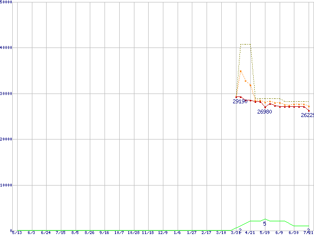 ※このグラフは過去のデータも税率5%相当に調整した税込み相当額のグラフです。 税率変更や、総額表示方式導入(2004年4月)の影響は除いています。 | | | ●凡例 | 最安値 (点線部は販売店未確認 または未調査) | 平均値 | 最高値 | ショップ数 |