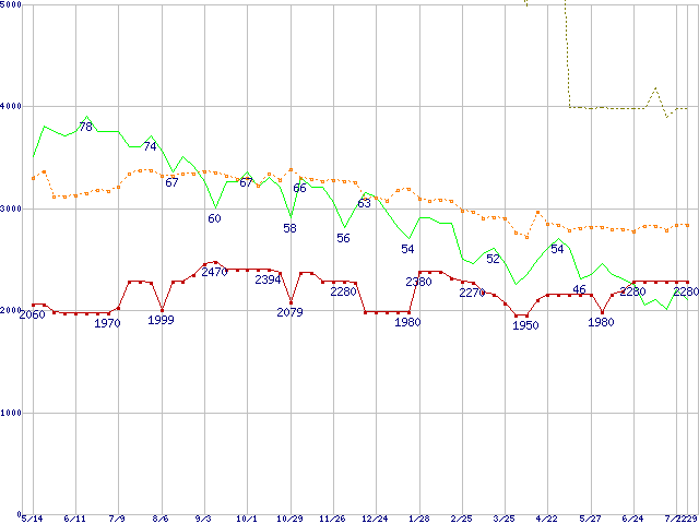 ※このグラフは過去のデータも税率5%相当に調整した税込み相当額のグラフです。 税率変更や、総額表示方式導入(2004年4月)の影響は除いています。 | | | ●凡例 | 最安値 (点線部は販売店未確認 または未調査) | 平均値 | 最高値 | ショップ数 |