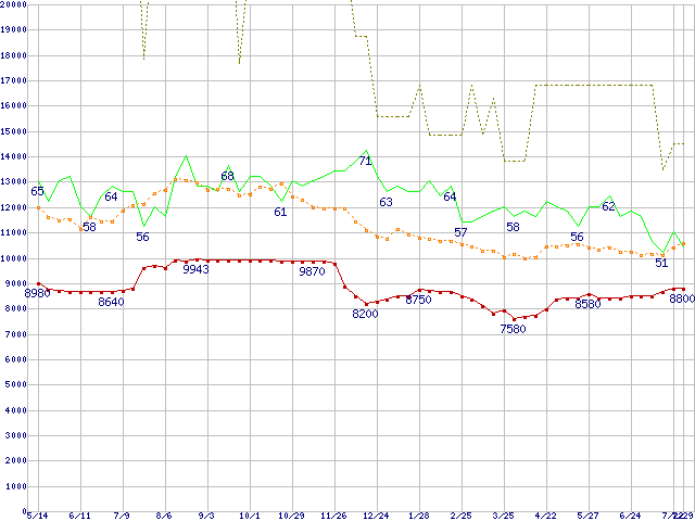 ※このグラフは過去のデータも税率5%相当に調整した税込み相当額のグラフです。 税率変更や、総額表示方式導入(2004年4月)の影響は除いています。 | | | ●凡例 | 最安値 (点線部は販売店未確認 または未調査) | 平均値 | 最高値 | ショップ数 |