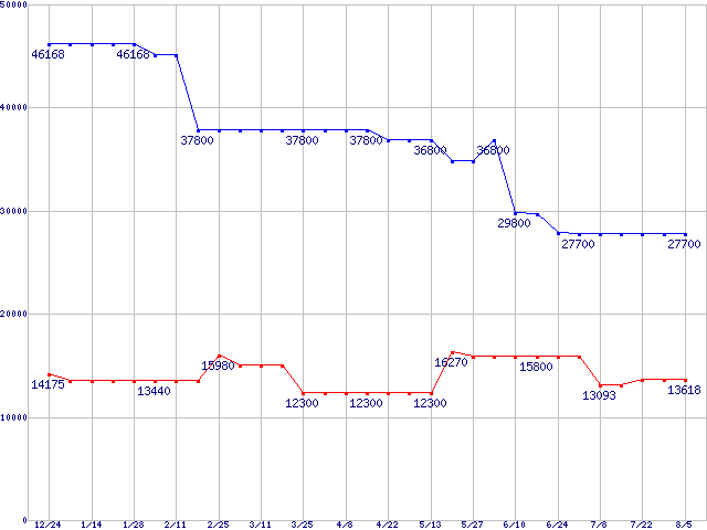 メモリ主要製品(最安値5千円~1万円未満)の最安値推移